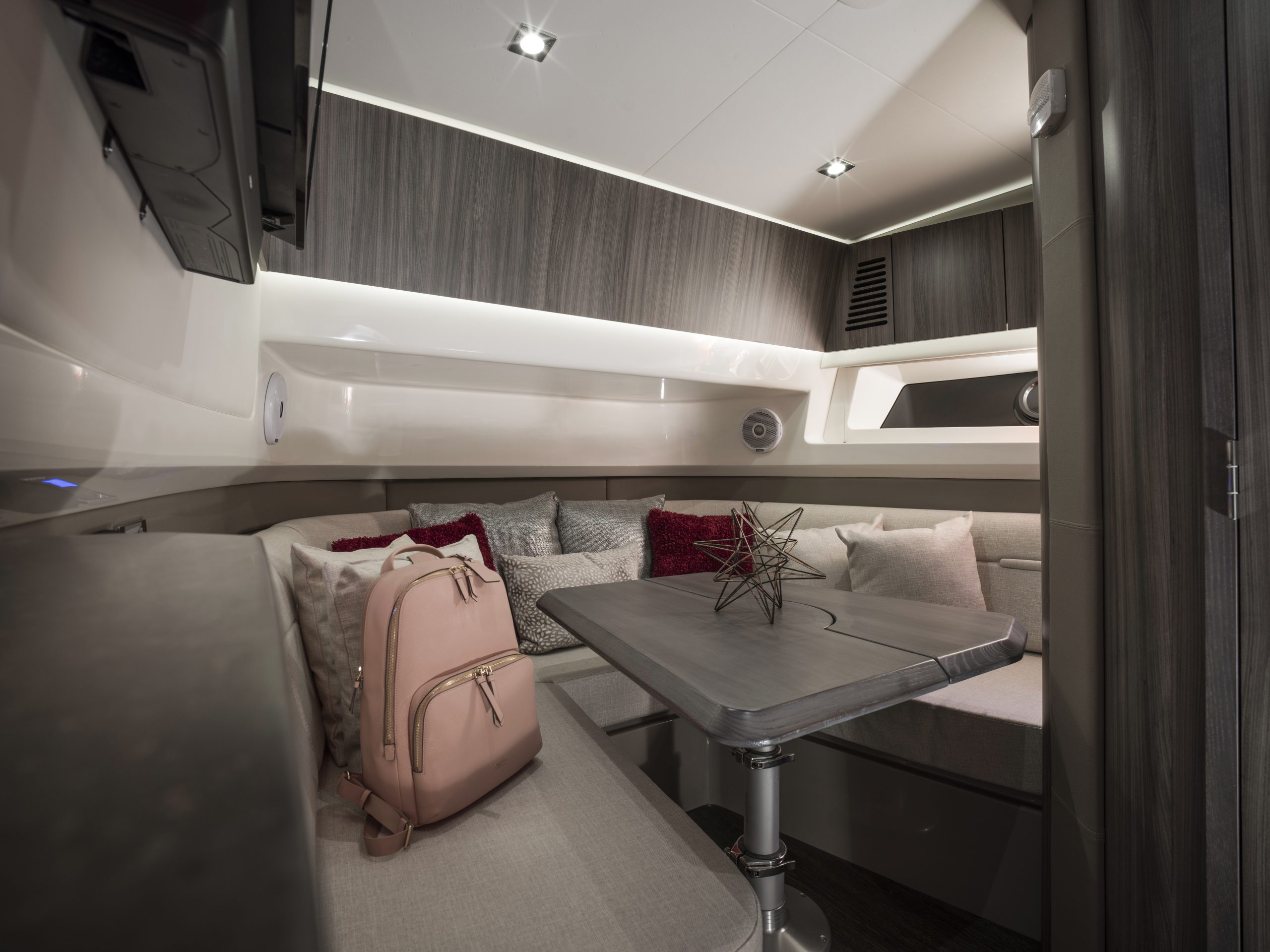 Dankzij de Yacht Certified-capaciteit biedt de boot ruimte aan iedereen die je wilt meenemen. Het boeggedeelte is voorzien van luxe touring seats met armleuningen en een converteerbare tafel, terwijl het zwemplatform, de cockpit en het interieur naadloos in elkaar overlopen. Elk detail, van zitcomfort tot technologie, is ontworpen om jouw dag op het water onvergetelijk te maken.