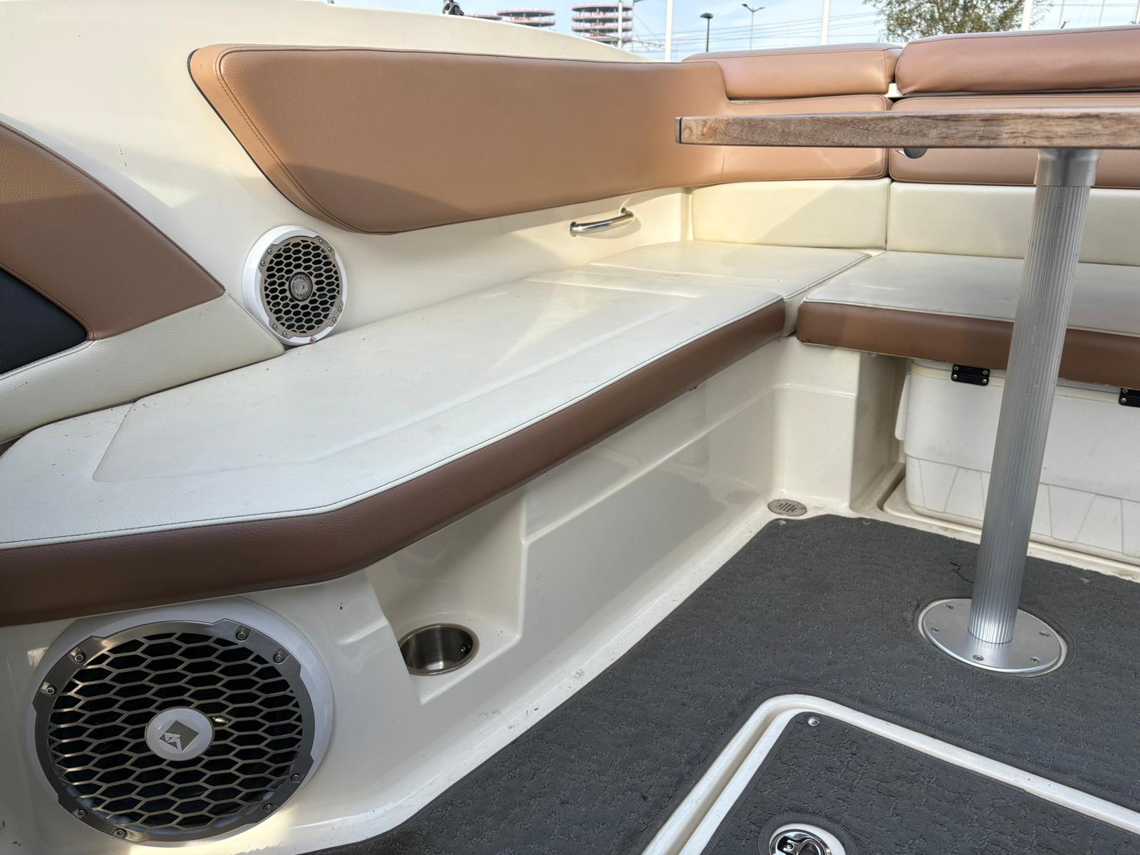De indeling is speels en doordacht: een royale L-vormige lounge met zonnedek en handige doorloopopties, twee comfortabele kuipstoelen met flip-up delen, en een ruime boeg met luxe kussenset. De hoogwaardige Bella Grana bekleding geeft de boot een premium uitstraling en past perfect bij het strakke design.