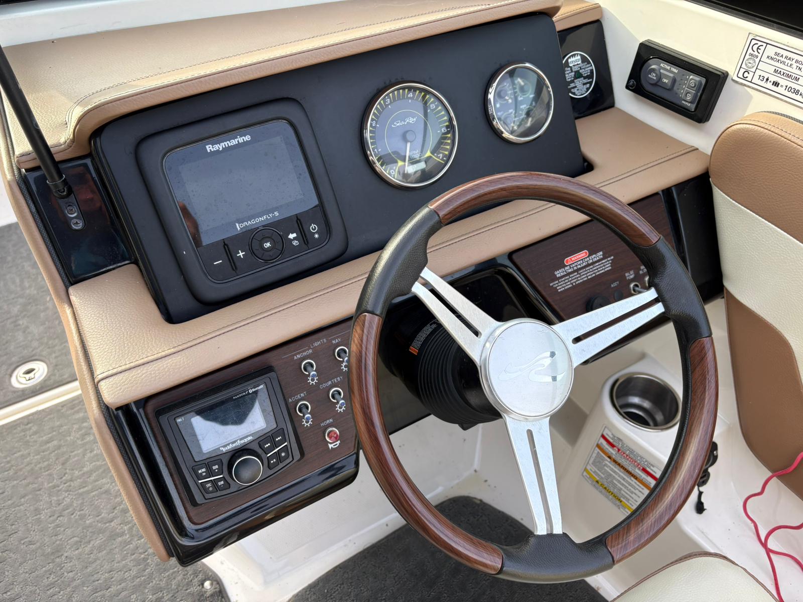 Het dashboard is voorzien van een Raymarine Dragonfly kaartplotter/fishfinder met helder kleurenscherm, aangevuld met een analoge snelheidsmeter en een gecombineerde teller voor brandstof, voltage, temperatuur en oliedruk. Zo houd je alle essentiële informatie overzichtelijk bij de hand.